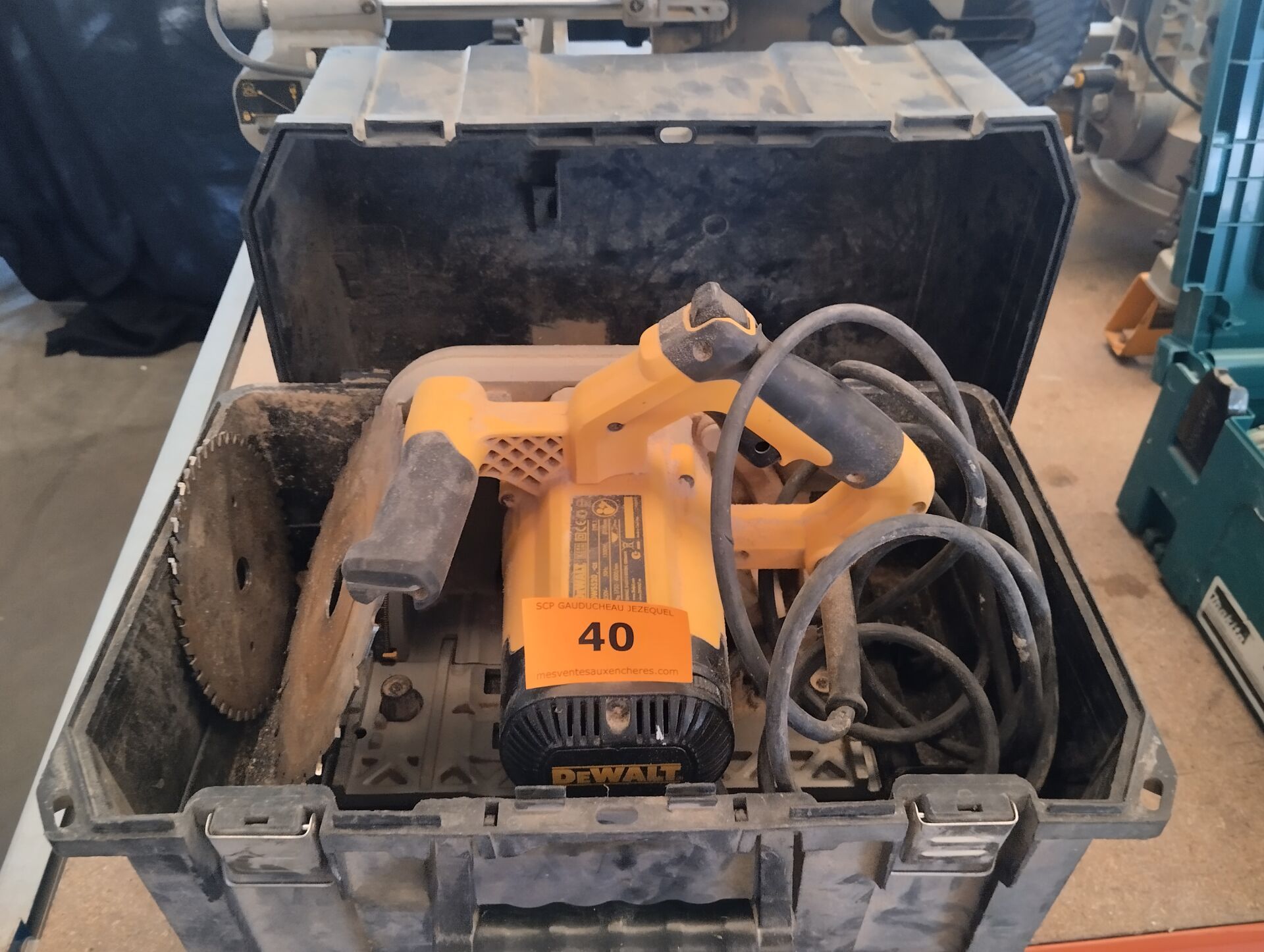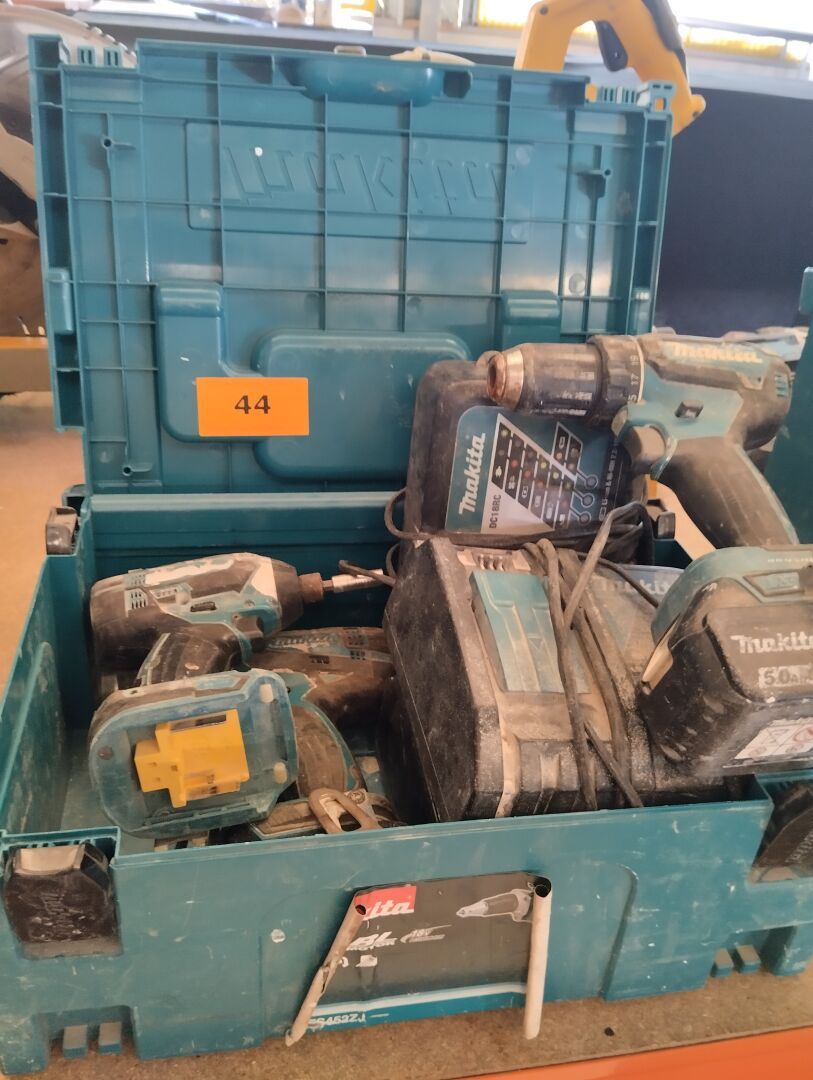 Caisse à outils WURTH garnie de scie cloche, scies, spatule, phare de chantier (état?),
