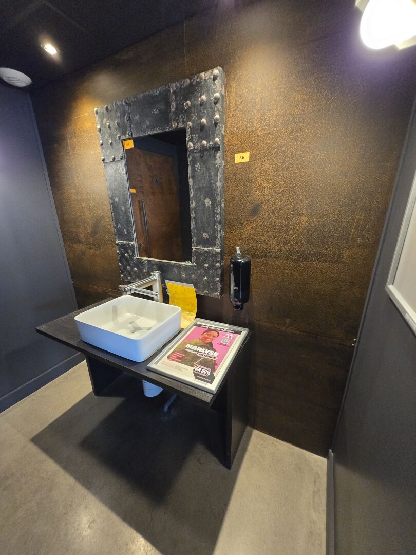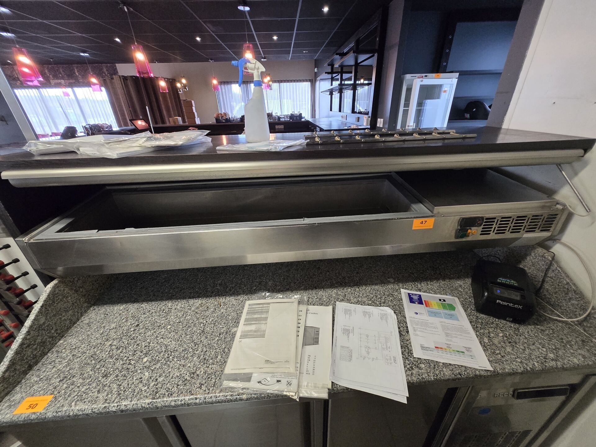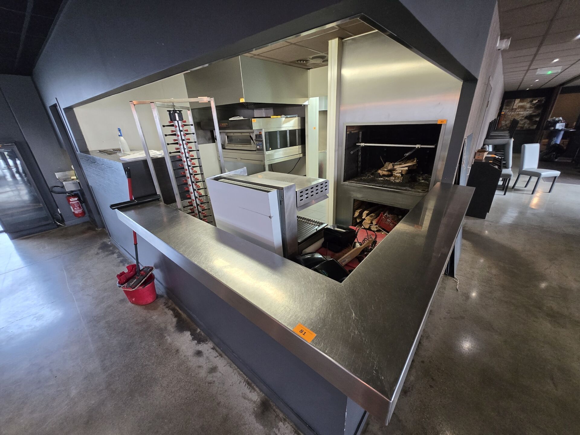 Bar en U avec plateau zinc, façade faux tiroirs, évier d'environ 5m de longueur x 3m75 de large / retour : 3m60 / passage : 72cm / tablette : 71cm avec estrade et arrière bar
