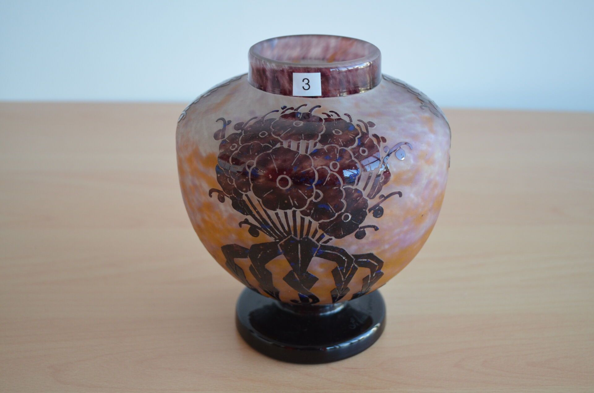 CHARDER (Charles Schneider 1881-1953) Vase boule en verre multicouche dégagé à l'acide teinté à décor floral stylisé mauve sur fond rose, signé, 16x18cm environ -