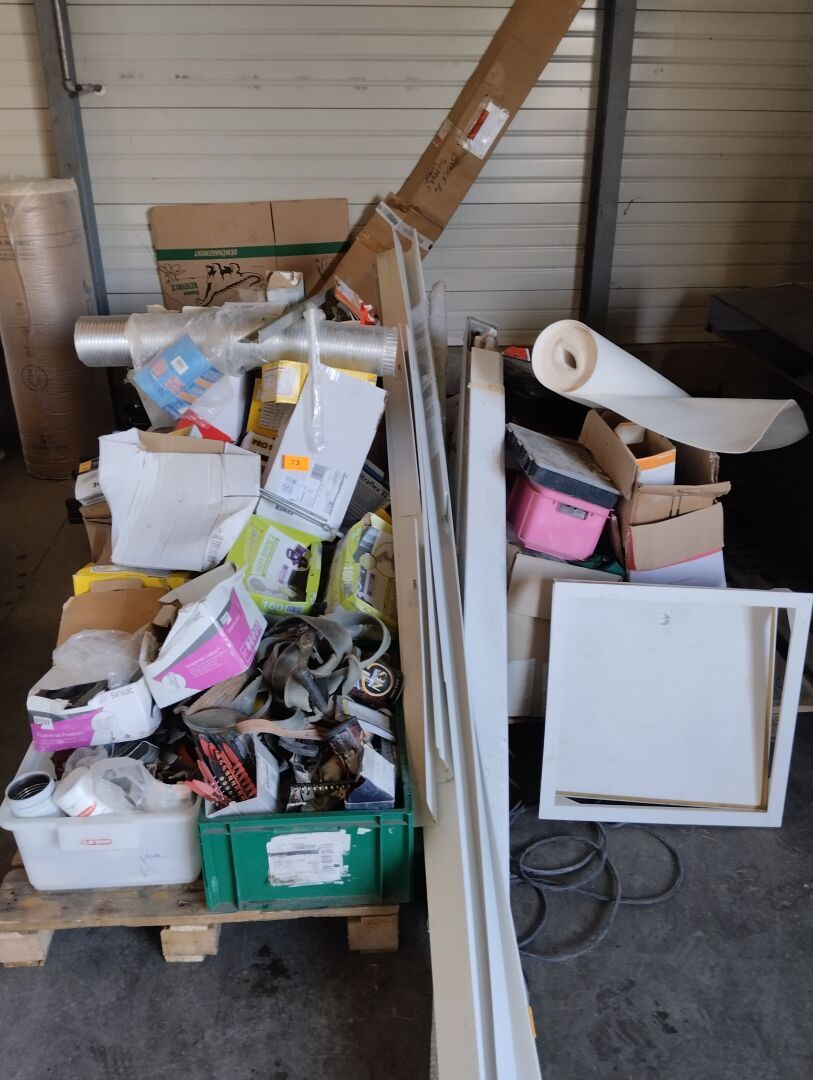 Stock résiduel de rails, portes (dont 2 complètes), cornières alu et PVC, quincaillerie, 5 pots d'enduits entamés, suspentes, visserie, boulonnerie, pointes de cloueurs, fixations d'isolant extérieur, gaines aluminium, joints, sangles, équerres, tiges, accessoires pour ventilation, 2 caisses vides.