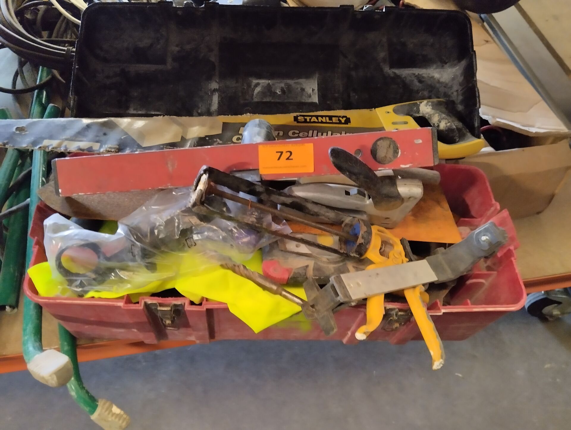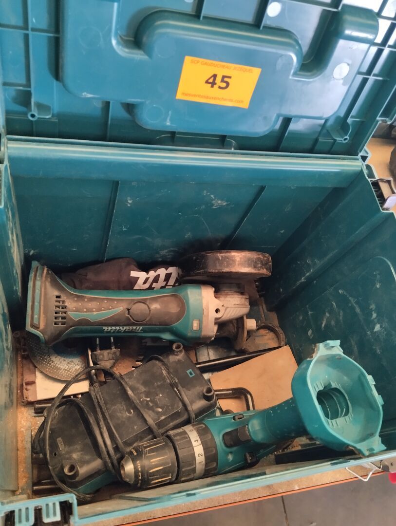 Caisse à outils WURTH garnie de scie cloche, scies, spatule, phare de chantier (état?),