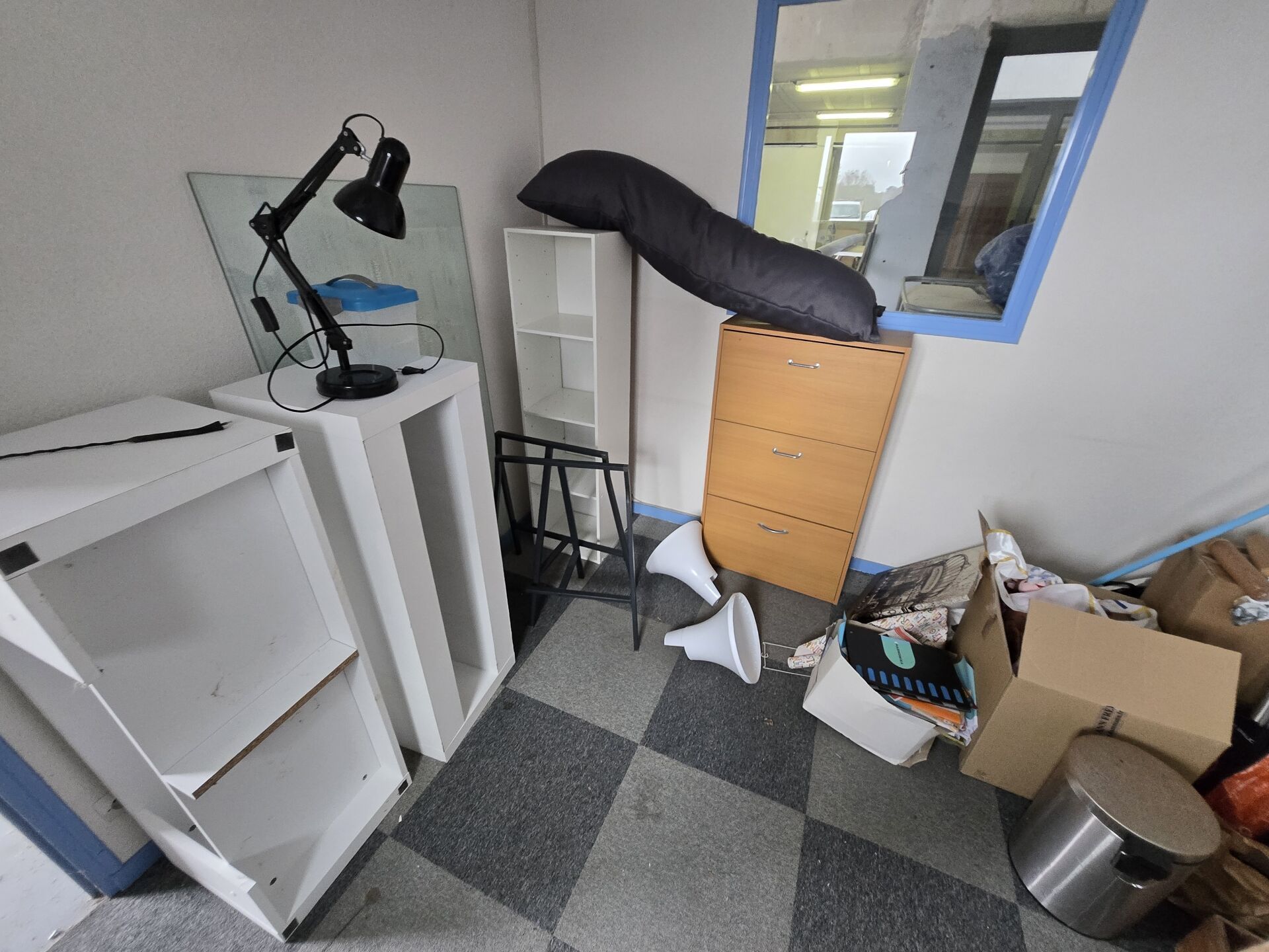 Ensemble comprenant PVC, sac bigbag, fourreaux, gaine ICTA, 2 meubles noirs, Meuble bar en l'état, 2 portes et chutes de bois
