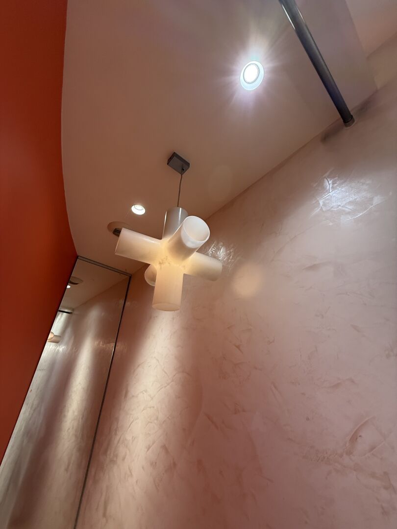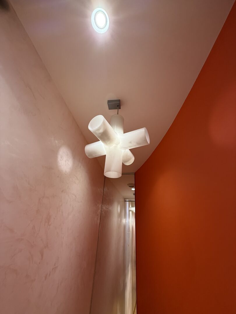 Suspension "Corail" blanc et Applique "Corail" orange (à démonter soigneusement). Hauteur 37 cm, Largeur 36 cm.
