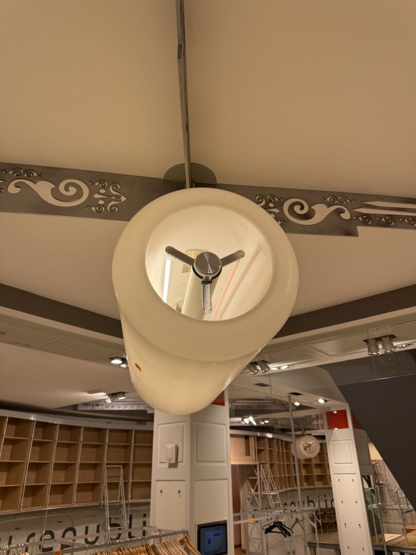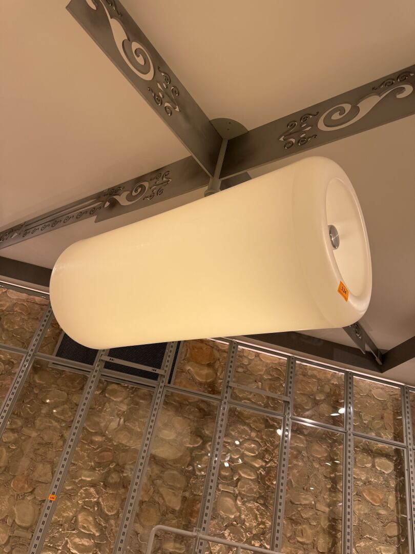 Luminaire en forme de réacteur en PVC blanc translucide et métal (133 cm x 56 cm).