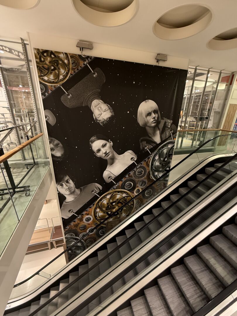 Grande toile décorative avec personnages et engrenage.