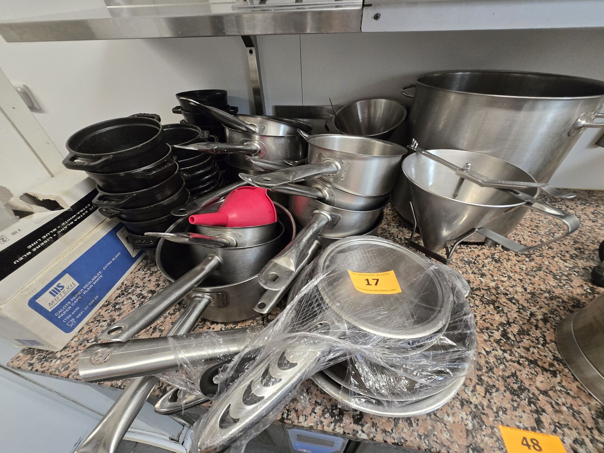 Ensemble d'environ 17 casseroles, 23 cocottes en fonte, faitout, chinois, saucier