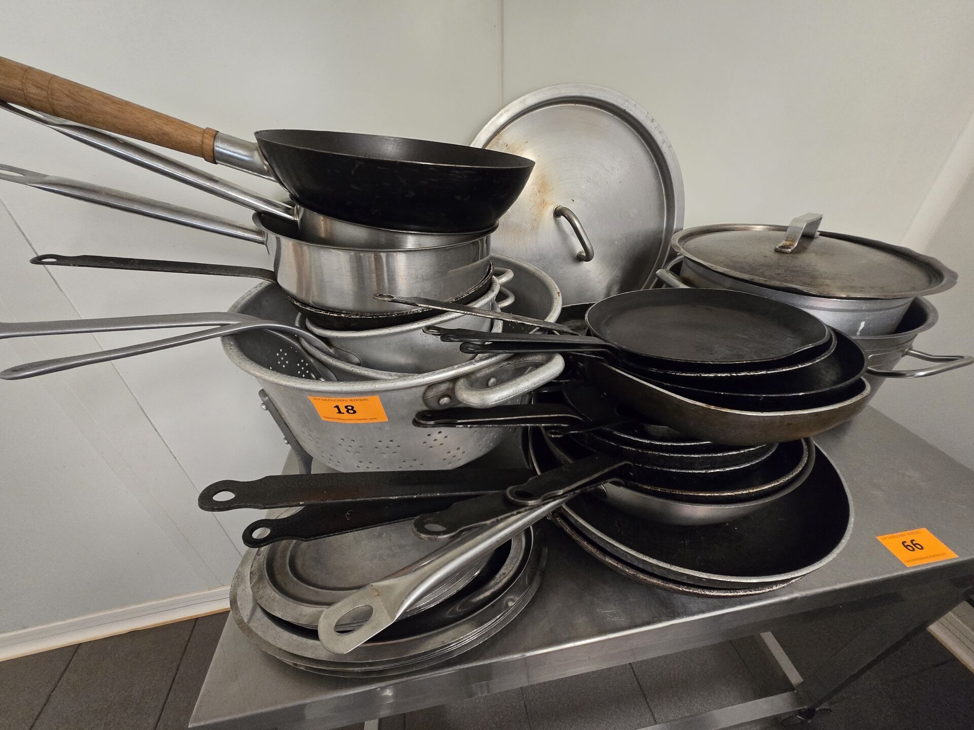 Ensemble d'environ 18 poëles, 2 faitous, 3 passoires, petit plat inox, couvercles