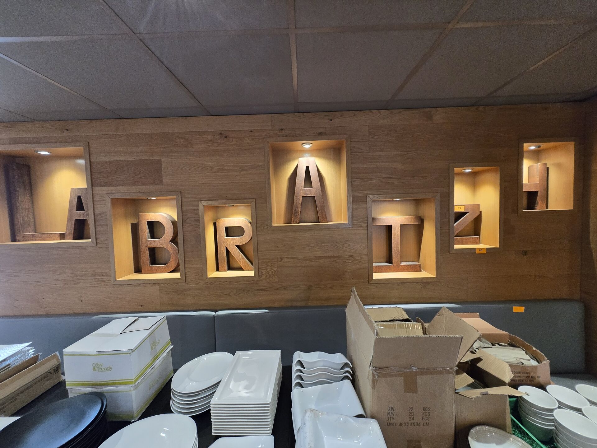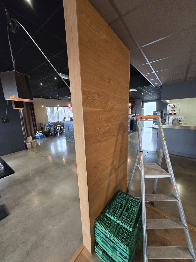 Bar en U avec plateau zinc, façade faux tiroirs, évier d'environ 5m de longueur x 3m75 de large / retour : 3m60 / passage : 72cm / tablette : 71cm avec estrade et arrière bar