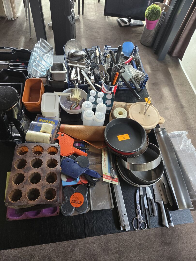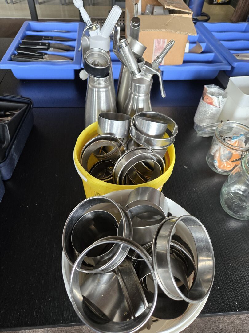 Ensemble de cercles, moules, couteaux, spatules, fouets, louches, mandolines, plats, pics à brochette