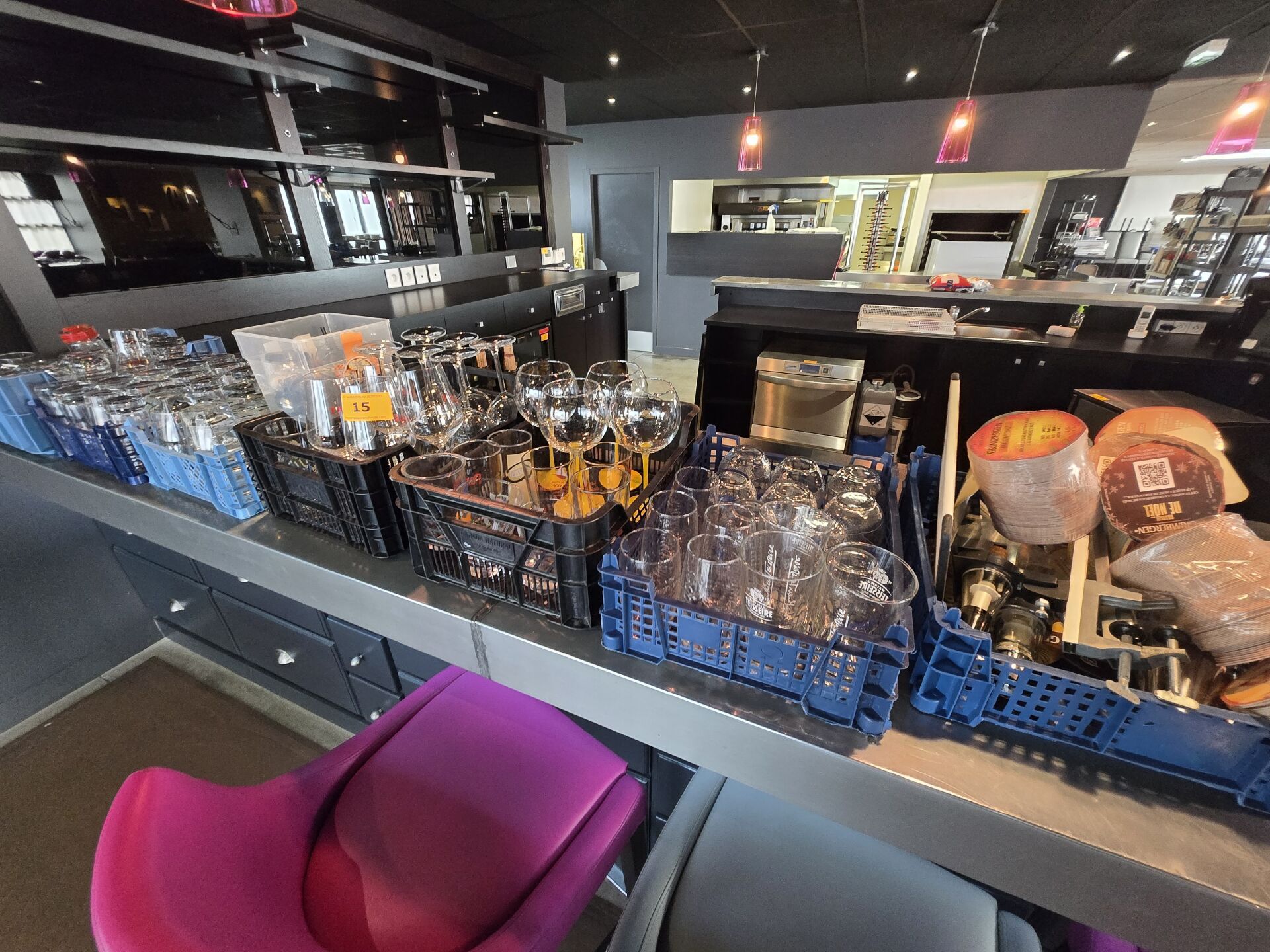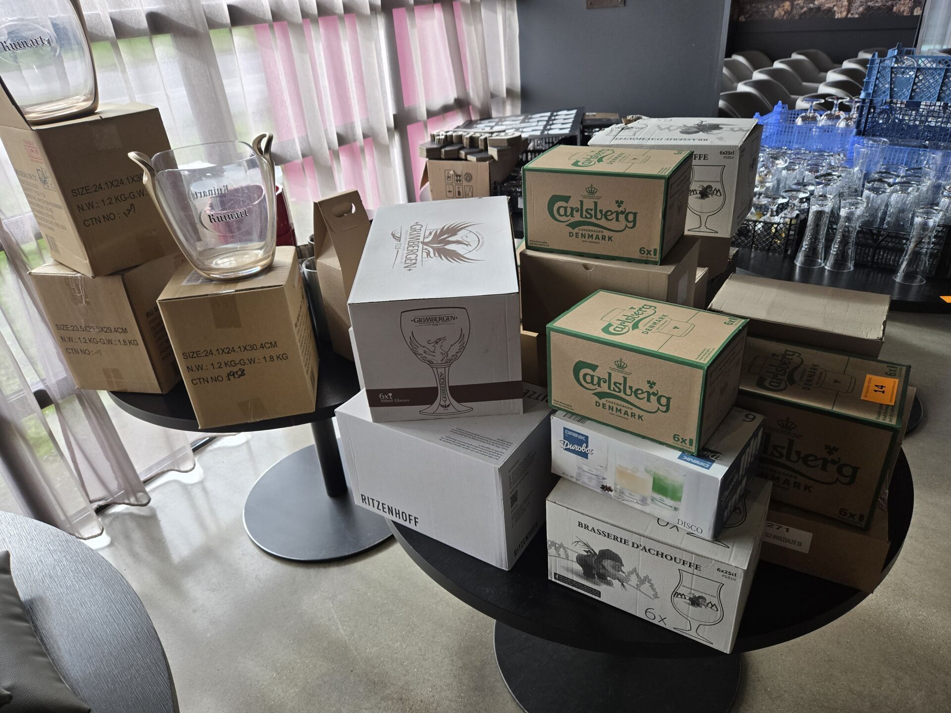 Dans environ 23 boites, environ 138 verres à bière publicitaires
